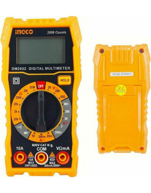 Λεπτομέρειες προϊόντος Για συνεχόμενο και για εναλλασσόμενο ρεύμα (AC/DC) Εύρος μέτρησης: (εύρος ενδείξεων μέτρησης 2000) • τάσης εναλλασσόμενου ρεύματος AC 200mV - 600V, • τάσης συνεχούς ρεύματος DC 200mV - 600V, • έντασης ρεύματος 20mA - 10A, • αντίστασης 200Ω - 2ΜΩ Οθόνη LCD με μεγάλα, ευδιάκριτα ψηφία Οπίσθιος φωτισμός (backlight) Συγκράτηση μέτρησης (hold) Έλεγχος συνέχειας με βομβητή (<30Ω) Αυτόματη απενεργοποίηση Kατηγορία μέτρησης CAT III