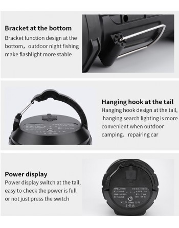 Διαθέτει ρυθμιζόμενη βάση στήριξης και γάντζο για κρέμασμα, αυξάνοντας την χρησιμότητα του για κάθε περίσταση. Τροφοδοτείται από 4 ενσωματωμένες μπαταρίες τύπου 18650 με χωρητικότητα 1500mAh η κάθε μία. Επίσης, εξοπλίζεται με θύρα USB για φόρτιση μικρών συσκευών.