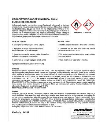 Καθαριστικός αφρός που περιέχει ισχυρά διεισδυτικό καθαριστικό με ιδιότητες αποσύνθεσης στους πιο επίμονους λεκέδες του κινητήρα. Μπορεί να αποβάλει λεκέδες πετρελαίου, βρωμιά και σκόνη από την επιφάνεια του κινητήρα, να τον κρατήσει καθαρό και να διευκολύνει την εκπομπή θερμότητας χωρίς να βλάπτει τα ελαστικά και τα πλαστικά μέρη ή τις βαμμένες επιφάνειες. Μπορεί επίσης να χρησιμοποιηθεί για τον καθαρισμό των λεκέδων και των ακαθαρσιών πετρελαίου στις επιφάνειες βιομηχανικών μηχανημάτων και άλλων συσκευών.