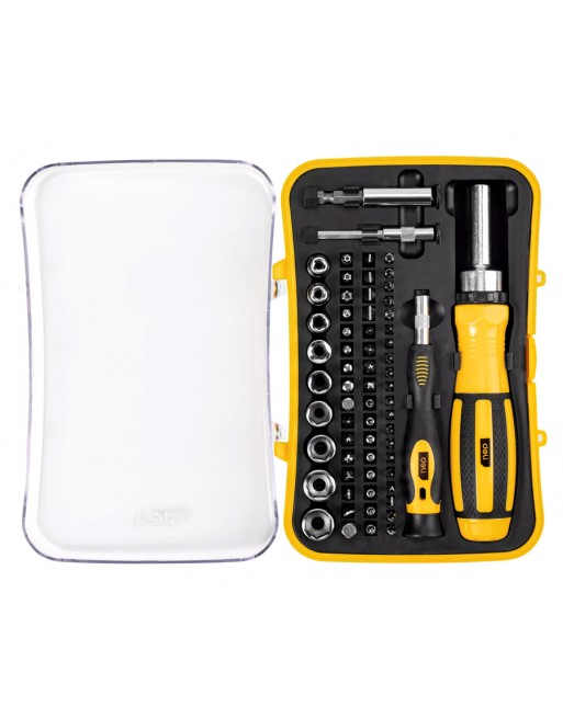 Σετ κατσαβιδιών ακριβείας της Deli το οποίο αποτελείται από 2 κατσαβίδια, 2 επεκτάσεις και 61 διαφορετικές κεφαλές και εξαρτήματα κατσαβιδιού.