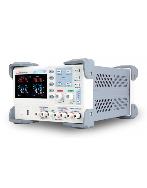 Τροφοδοτικό πάγκου 3 καναλιών από την Uni-T. Διαθέτει 4 ανεξάρτητες εξόδους, 2 από αυτές είναι ρυθμιζόμενες των 30V/5A, 1 σταθερής επιλεγμένης εξόδου των 1.8V/2.5V/3.3V/5V/3A, και USB με έξοδο 5V/2A. Με constant voltage (CV) και constant current (CC) modes, προστασία από βραχυκύκλωμα και υπερφόρτωση, το DC τροφοδοτικό πάγκου UDP3305C χαρακτηρίζεται για την εξαιρετική απόδοση του.