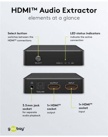 Το HDMI audio extractor της Goobay σας επιτρέπει την κρυστάλλινη μετάδοση ήχου για την σύνδεση συστημάτων ψυχαγωγίας και gaming με συστήματα Hi-Fi ή μπάρες ήχου μέσω HDMI.