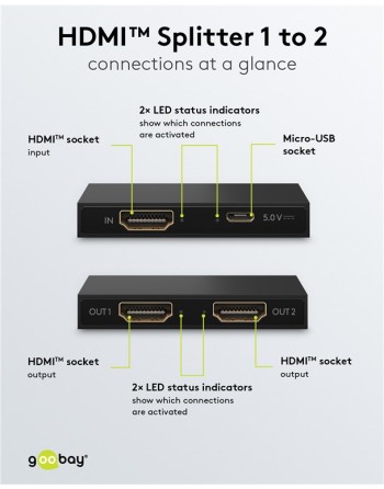 Το HDMI splitter της Goobay σας επιτρέπει την σύνδεση 1x συσκευής εισόδου όπως PC σε 2x συσκευών εξόδου όπως οθόνες.