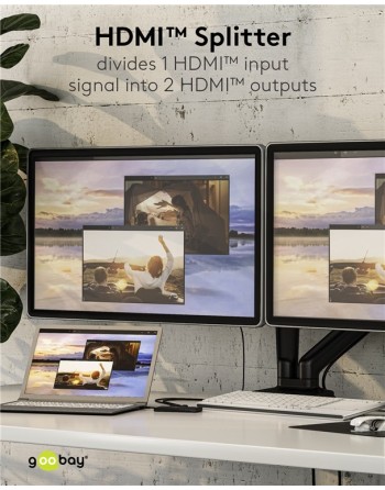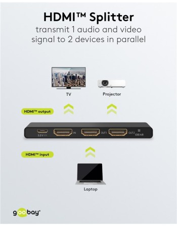 Το HDMI splitter της Goobay σας επιτρέπει την σύνδεση 1x συσκευής εισόδου όπως PC σε 2x συσκευών εξόδου όπως οθόνες.