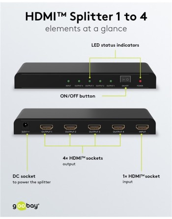 Το HDMI splitter της Goobay σας επιτρέπει την σύνδεση 1x συσκευής εισόδου όπως PC σε 4x συσκευών εξόδου όπως οθόνες.