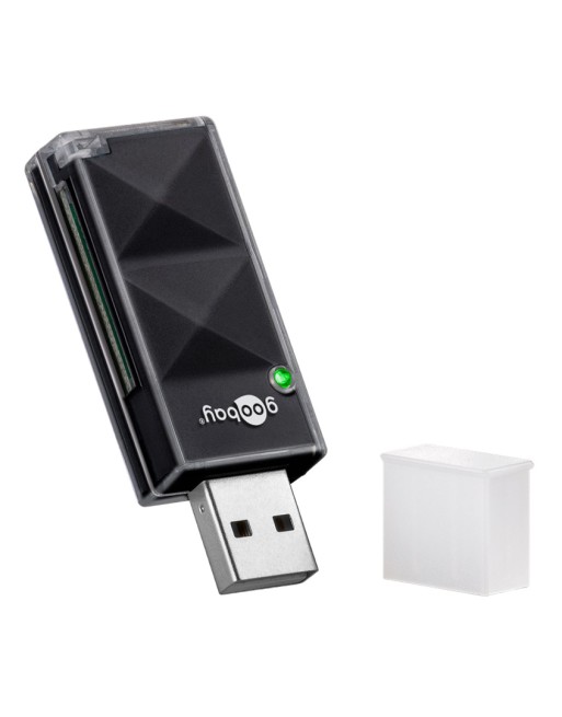 Card reader σε μέγεθος USB flash από την Goobay, με υποδοχή στην οποία μπορείτε να τοποθετήσετε μια SD κάρτα μνήμης. Συνδέεται απευθείας σε desktop ή laptop μέσω θύρας USB.
