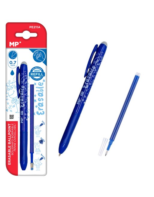 Στυλό διαρκείας της MP με μελάνι που σβήνει μέσω της ειδικής γόμας που διαθέτει. Έχει μύτη πάχους 0.7mm και αντιολισθητική, εργονομική λαβή. Διαθέτει καπάκι με κλικ για να ασφαλίζει στις τσέπες των ρούχων και στα τετράδια. Στη συσκευασία συμπεριλαμβάνεται ανταλλακτικό μελάνι.