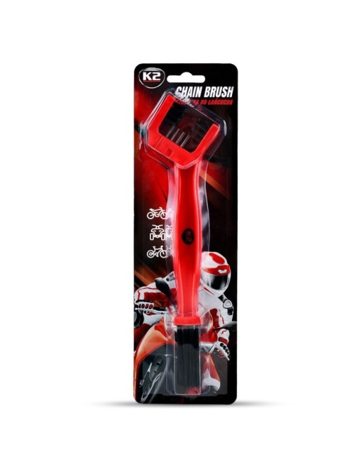 The universal K2 chain cleaning brush is designed for cleaning drive chains of motorcycles, mopeds, bicycles (including mountain bikes) and quads. The K2 brush enables you to thoroughly clean the chain from all sides, increasing its service life and minimizing the risk of failure. The head of our brush consists of two detachable parts, making it easy to keep clean. The specially designed U-shaped housing helps to clean the chain from three sides simultaneously. The chain can be cleaned without the need to disassemble it. The K2 motorcycle chain cleaning brush is also perfect for cleaning other elements, e.g. sprockets, cassette sprockets, bolts, nuts, chain guards. Brush bristles made of polypropylene with high chemical resistance and mechanical durability, are perfect in removing dirt and soiling from both chains and other elements. The use of two types of bristle thickness (thicker in the brush part, thinner in the stiff brush part) makes the work easier. The contoured, solid plastic handle makes reaching difficult places a child's play. Perfect for pre- and post-season maintenance.