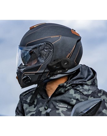Σύστημα ενδοεπικοινωνίας με Bluetooth για κράνος μηχανής από την SCSETC. Επιτρέπει την ενδοεπικοινωνίας μεταξύ του αναβάτη και του επιβάτη ή μεταξύ έως 6 αναβατών μηχανής σε εμβέλεια έως 500 μέτρα.