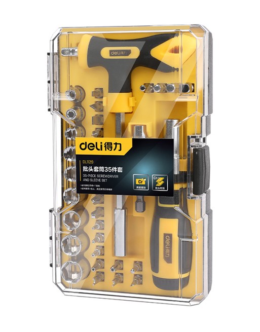 Σετ κατσαβιδιών ακριβείας της Deli το οποίο αποτελείται από 1 κατσαβίδι, 1 κλειδί τύπου Ταφ, 2 αντάπτορες και 31 διαφορετικές κεφαλές και εξαρτήματα κατσαβιδιού. Είναι τοποθετημένα μέσα σε πλαστική θήκη, για την εύκολη τακτοποίηση και μεταφορά τους.