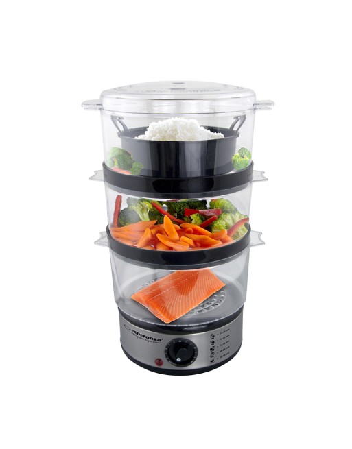 Ηλεκτρικός Ατμομάγειρας 400W με 3 Διαφανή Αποσπώμενα διαμερίσματα 7.5L και καπάκι, Esperanza Ο ατμομάγειρας από την Esperanza, ισχύος 400 W με βάση από ανοξείδωτο ατσάλι και χρονοδιακόπτη 60 λεπτών, δε θα πρέπει να λείπει από την κουζίνα. Ο ατμομάγειρας, είναι εξοπλισμένος με τρία επίπεδα μαγειρέματος, δηλαδή 3 καλάθια με συνολική χωρητικότητα 7.5 Lt. Τα καλάθια του ατμομάγειρα, είναι φτιαγμένα από υψηλής ποιότητας υλικά, που εξασφαλίζουν πλήρη και υγιεινά γεύματα.