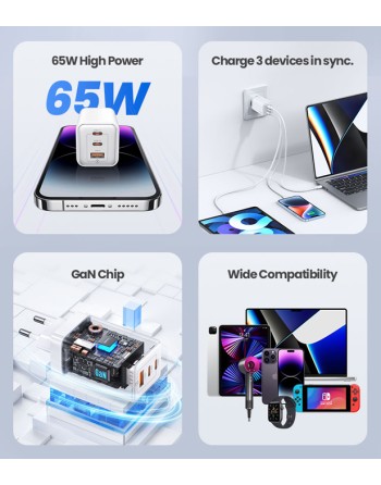 USAMS φορτιστής τοίχου US-CC180, USB & 2x USB-C, 65W PD, GaN, λευκός