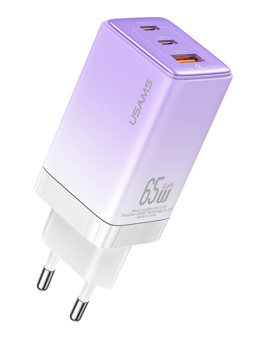 USAMS φορτιστής τοίχου US-CC180, USB & 2x USB-C, 65W PD, GaN, μωβ