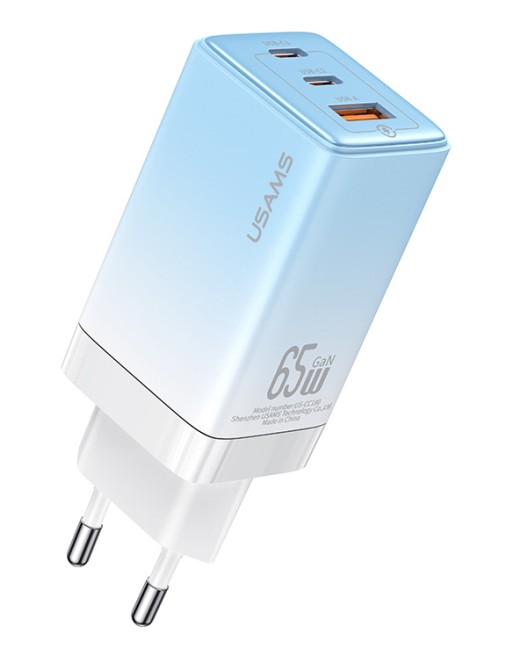 USAMS φορτιστής τοίχου US-CC180, USB & 2x USB-C, 65W PD, GaN, μπλε