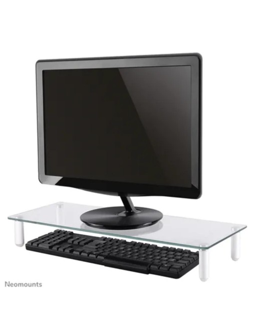 The Neomounts monitor riser, model NSMONITOR10 is a monitor riser for screens up to 25 kilo. It fits CRT and flat screens. Stunning looks due to crystal clear glass material. The surface is polished for optimum appearance. The keyboard fits under the riser to keep the workplace clean. Change the height of your screen with 8 cm. Width 56 cm and depth 21 cm. By using an ergonomic mount neck- and back complaints can be avoided. Ideal for use in offices and on counters or in a reception area.