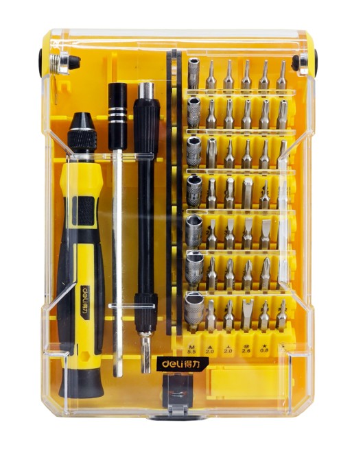 Σετ της Deli το οποίο αποτελείται από 1 κατσαβίδι, 2 αντάπτορες επέκτασης και 42 διαφορετικές μύτες κατσαβιδιού.