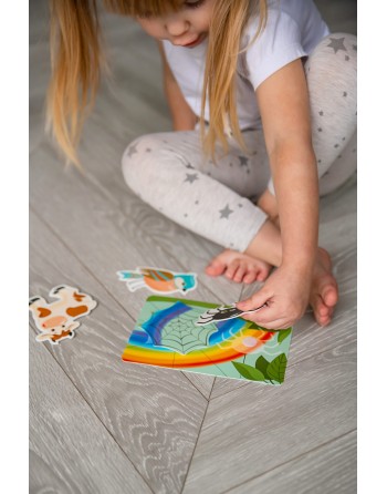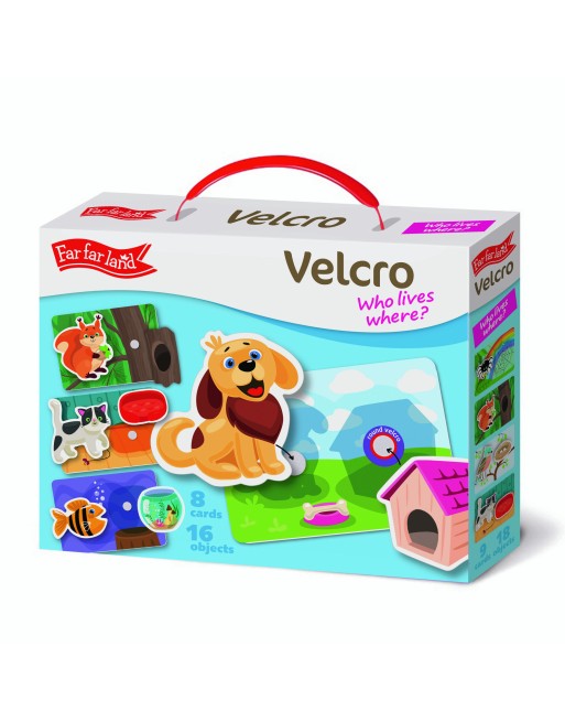 Το κιτ περιλαμβάνει κάρτες και αντικείμενα που συνδέονται στις κάρτες με Velcro. Το παιδί πρέπει να βρει ποια αντικείμενα να συνδέσει σε μια συγκεκριμένη κάρτα και να συνδέσει με ακρίβεια το Velcro έτσι ώστε η φιγούρα να κολλάει σταθερά στην εικόνα.