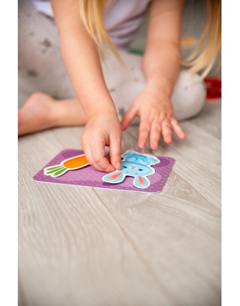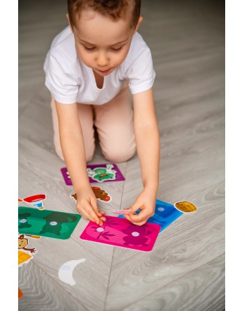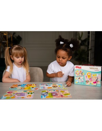 Το κιτ περιλαμβάνει κάρτες και αντικείμενα που συνδέονται στις κάρτες με Velcro. Το παιδί πρέπει να βρει ποια αντικείμενα να συνδέσει σε μια συγκεκριμένη κάρτα και να συνδέσει με ακρίβεια το Velcro έτσι ώστε η φιγούρα να κολλάει σταθερά στην εικόνα.