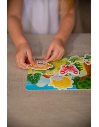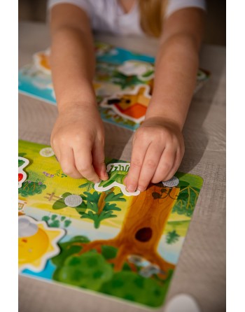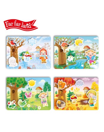 Το σετ περιλαμβάνει κάρτες και αντικείμενα που είναι προσαρτημένα στις κάρτες με Velcro. Κάθε κάρτα παιχνιδιού απεικονίζει μία από τις εποχές του χρόνου και μια απλή πλοκή. Η εργασία του παιδιού είναι να επαναφέρει τα στοιχεία της εικόνας στις θέσεις τους. Πότε παίζουν χιονόμπαλες; Πότε μπορούν να πάνε στο δάσος για μούρα και μανιτάρια; Ως υπόδειξη για το μωρό, κάθε αντικείμενο σημειώνεται στην κάρτα με μια σιλουέτα.