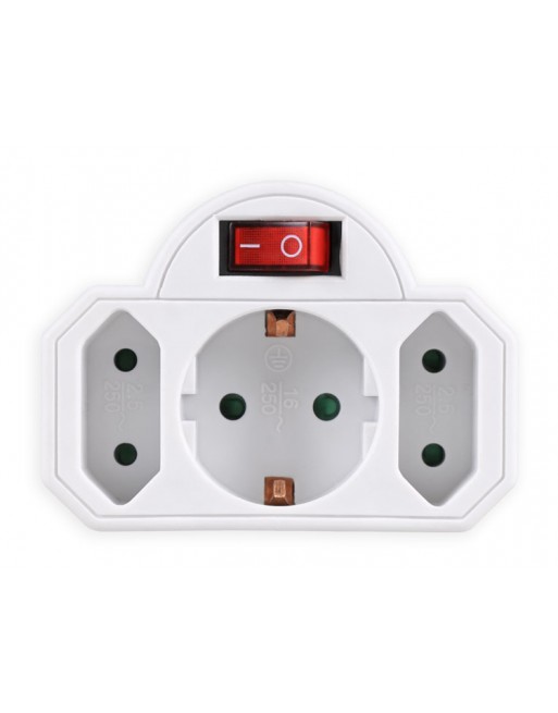Αντάπτορας ρεύματος Powertech 3 θέσεων, 1x schuko και 2 διπολικών, με διακόπτη On/Off και μηχανισμό ασφαλείας για παιδιά.