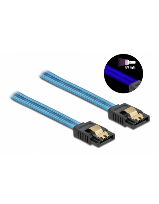 Καλώδιο SATA III της Delock με μεταλλικά clip και UV επίστρωση, το οποίο λάμπει όταν φωτιστεί από λάμπα UV υπεριώδους φωτός.