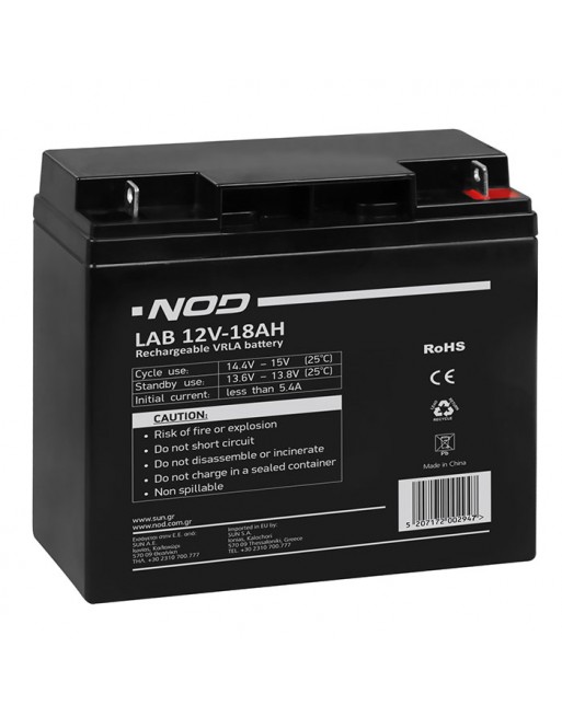 Η μπαταρία μολύβδου NOD LAB 12V-18AH διασφαλίζει την παροχή αδιάλειπτης ισχύος στον εξοπλισμό σου. Έχει μεγάλη διάρκεια ζωής και χαμηλό βαθμό αυτοεκφόρτισης.