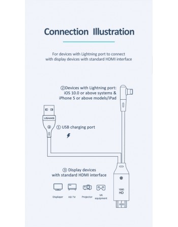 Με το καλώδιο αυτό πραγματοποιείται σύνδεση από συσκευή Lightning σε τηλεόραση που διαθέτει HDMI. Είναι κατασκευασμένο από υψηλής ποιότητας υλικά ,όπως αλουμίνιο και καλώδιο με braided μόνωση, η οποία προσφέρει μέγιστη προστασία του καλωδίου από τσακίσεις.