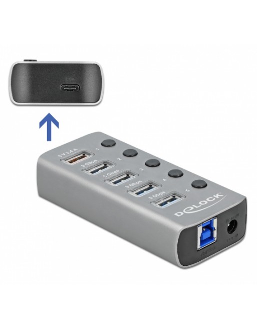 DELOCK hub 5x USB + 1x Type-C PD με διακόπτες 63263, 5Gbps, 2.4A, γκρι