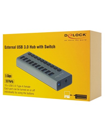 DELOCK hub 10x USB με διακόπτες 63976, USB 3.0, 5Gbps, 4A, LED, γκρι