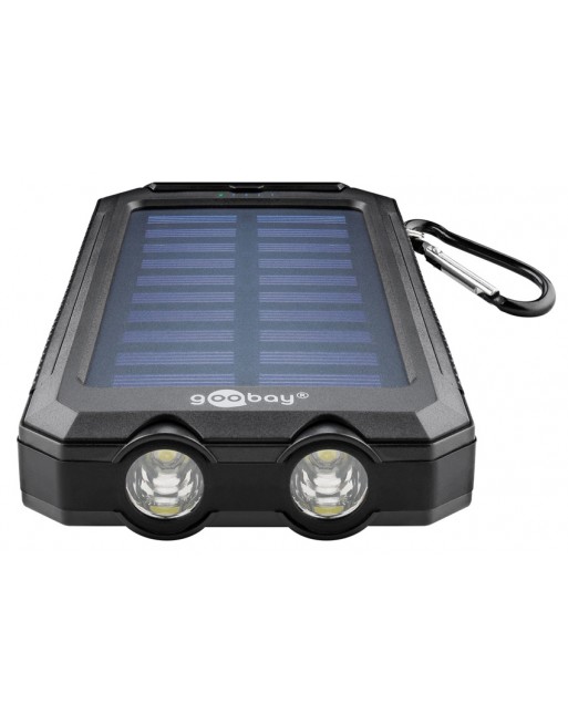 Power bank χωρητικότητας 8000mAh της Goobay, ιδανικό για υπαίθριες δραστηριότητες όπως η ορειβασία και η πεζοπορία. Έχει στιβαρό σχεδιασμό με αντιολισθητικές πλευρές για σταθερό κράτημα και αδιάβροχη προστασία IP45. Φορτίζει μέσω καλωδίου USB Micro B (συμπεριλαμβάνεται) ενώ διαθέτει και ηλιακό πάνελ φόρτισης. Με 2 θύρες USB για ταυτόχρονη φόρτιση 2 συσκευών και ένδειξη φόρτισης LED. Διαθέτει φακό 2 εξαιρετικά φωτεινών LED με λειτουργία SOS, ο όποιος ενεργοποιείται και απενεργοποιείται με διπλό πάτημα του διακόπτη. Εξοπλίζεται επίσης με πυξίδα και γάντζο για να μπορεί να γαντζώνεται σε σακίδιο.