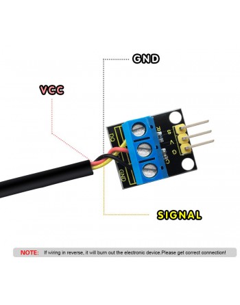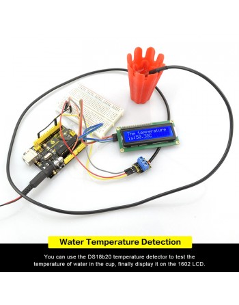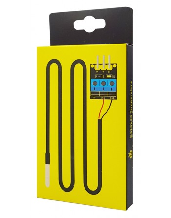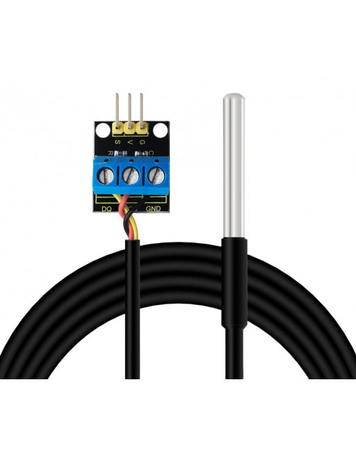 Αισθητήρας ανίχνευσης θερμοκρασίας της Keyestudio DS18b20, κατάλληλος για τη μέτρηση της θερμοκρασίας πεδίου. Κάθε pin του chip διαχωρίζεται με σωλήνα συρρίκνωσης θερμότητας για να αποφευχθεί το βραχυκύκλωμα και σφραγίζεται στο εσωτερικό καθιστώντας τον αισθητήρα αδιάβροχο και damp-proof. Η άμεση ψηφιακή μετάδοση "One line Bus" βελτιώνει σημαντικά την ικανότητα anti-jamming του συστήματος. Το μετρήσιμο εύρος θερμοκρασίας είναι από -55°C έως +125°C.