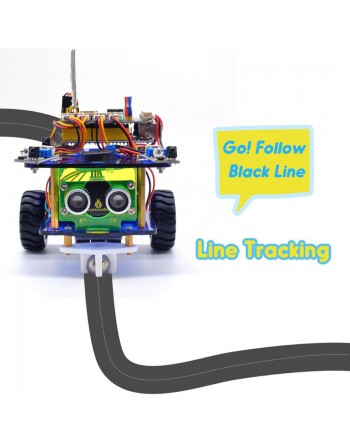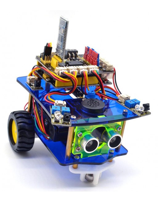 Το kit desktop mini bluetooth smart car V3.0 σας δίνει την δυνατότητα να κατασκευάσετε το δικό σας smart car ρομπότ μέσω της ολοκλήρωσης πολλών δημιουργικών projects και να μάθετε να το ελέγχετε με mixly blocks coding. Διαθέτει λειτουργίες όπως line tracking, αποφυγή εμποδίων, cross maze, ultrasonic following, gravity sensing, φωνητικό έλεγχο, έλεγχο από ασύρματο χειριστήριο IR και smartphone μέσω Bluetooth. Επιπλέον συμπεριλαμβάνει μονάδα ήχου μικρόφωνου που επιτρέπει την αναπαραγωγή μουσικής ή άλλων ήχων κατά την διάρκεια της οδήγησης του smart car. Ο έλεγχος από smartphone γίνεται μέσω της εφαρμογής Dekstop Car για Android και της εφαρμογής Keyes BT Car για iOS. Η τροφοδοσία του ρομπότ μπορεί να γίνει με 2x μπαταρίες 18650 ή 4x μπαταρίες AA 1,5V (δεν συμπεριλαμβάνονται).
