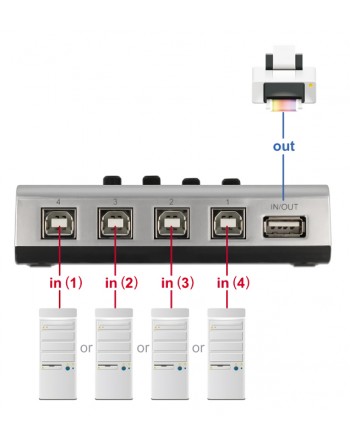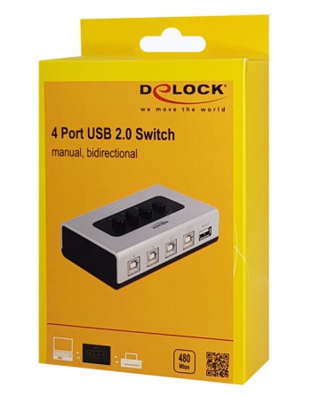 Το bidirectional switch της Delock, διπλής κατεύθυνσης, δίνει την δυνατότητα σύνδεσης 4 υπολογιστών σε μια περιφερειακή συσκευή μέσω θύρας USB. Εξοπλίζεται με 4 πλήκτρα για την επιλογή του υπολογιστή, ο οποίος θα συνδεθεί με την περιφερειακή συσκευή.